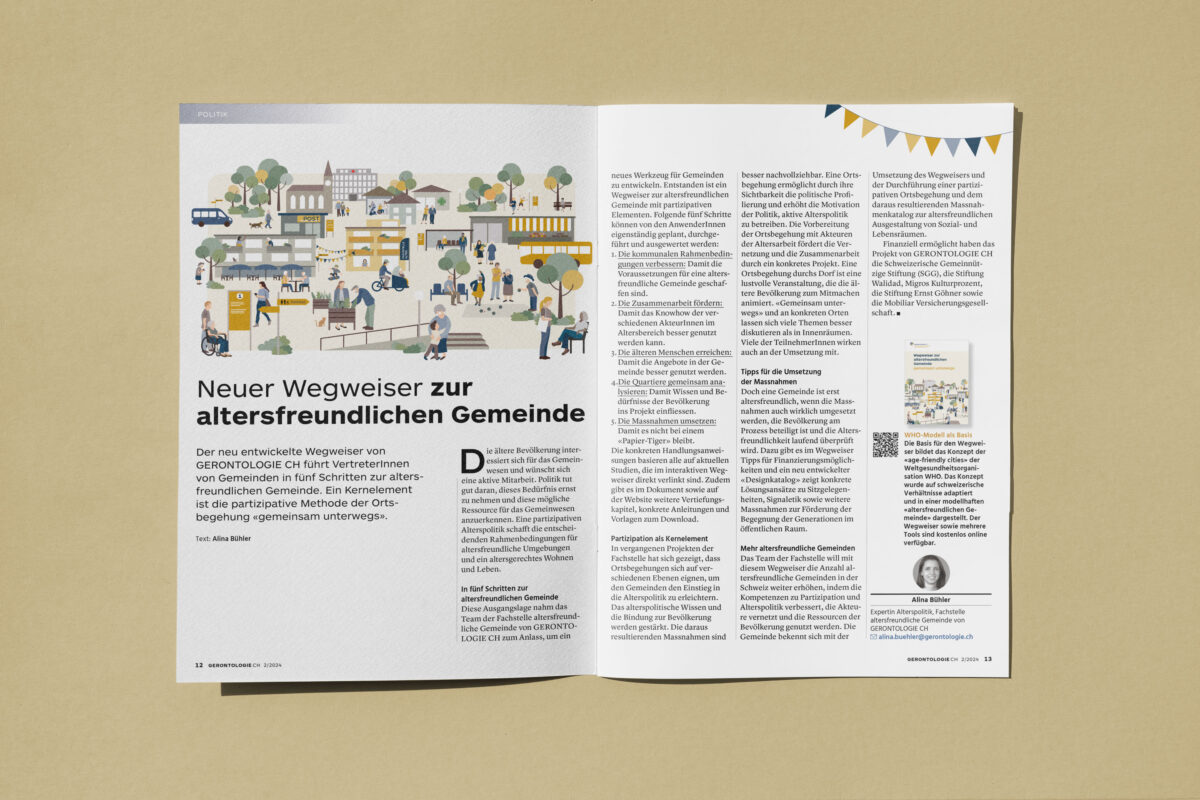 komform entwickelt für die Fachorganisation GERONTOLGIE CH nicht nur das Naming, das Marketingkonzept und das Corporate Design, sondern auch das gleichnamige Magazin. komform ist verantwortlich für Redaktion und altersgerechtes Design des Fachmagazins, welches dreimal jährlich erscheint. Das Magazin hält alle Interessierten über relevante Neuerungen aus gerontologischer Forschung und Praxis auf dem Laufenden. komform leitet die Fachredaktion und unterstützt die Autor*innen nur mit einem alterssensiblen Textlektorat, sondern auch in der Themen- und Bildauswahl und im Story-Design.