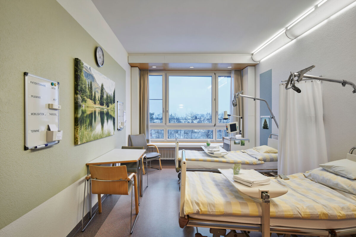 Wie das gehen kann, zeigt ein Projekt fürs Lindenhofspital Bern. Die Berner Fachhochschule und komform haben vor Ort Analysen und Befragungen gemacht. Auf dieser Grundlage hat komform ein kostengünstiges Gestaltungskonzept entwickelt, um die in die Jahre gekommenen Zimmer für Patientinnen und Patienten zu verschönern. Und gleichzeitig die räumliche und zeitliche Orientierung im Zweibettzimmer zu verbessern. Es handelt sich um ein Musterzimmer, welches kostengünstig vervielfältigt werden kann.