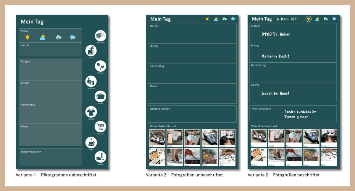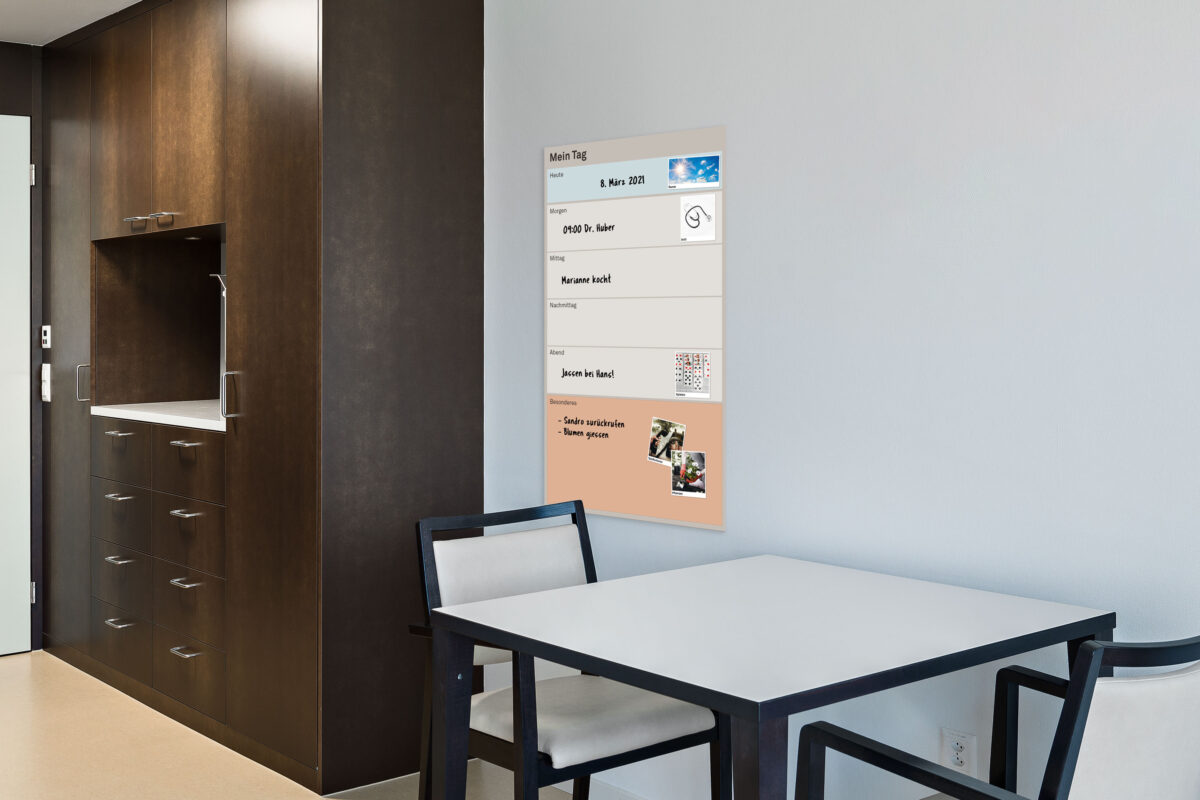Menschen mit Demenzerkrankung können sich oft nicht mehr daran erinnern, wie sie ihren Tag sinnvoll verbringen könnten. komform hat einen beschreibbaren Tagesplan mit Foto-Magneten entwickelt, die als Erinnerungsstütze dienen. Der Tagesplan eignet sich für den Privatgebrauch oder für den Einsatz für Gruppen in stationären Tagesstrukturen.