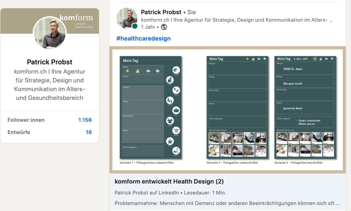 Aufgrund von ersten Entwürfen hat komform zuerst eine Linkedin-Umfrage gemacht, mit folgenden Fragestellung: Sind Piktogramme oder Fotos besser geeignet, um Erinnerungen zu wecken? Welche weiteren Optimierungsmöglichkeiten bestehen?